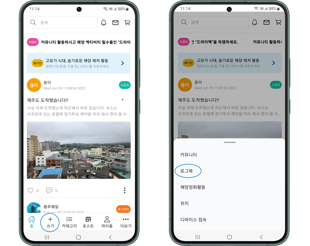 앱 실행 ➜ ✚ 쓰기 ➜ 로그북을 클릭합니다.