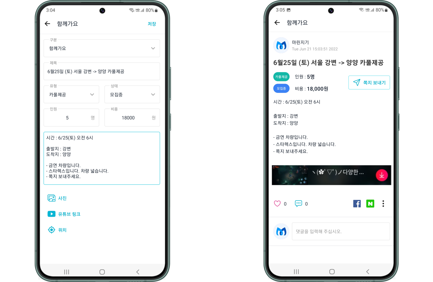 또한 동행/ 카풀요청도 상황에 맞게 같은 방법으로 작성할 수 있습니다.
