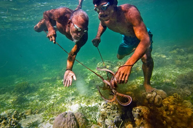 숨을 10분 넘도록 참을 수 있고 최대 70m 까지 잠수하여 바다속을 걸어다니면서 물고기를 잡을 수 있는 물 속에 특화된 사람들입니다.