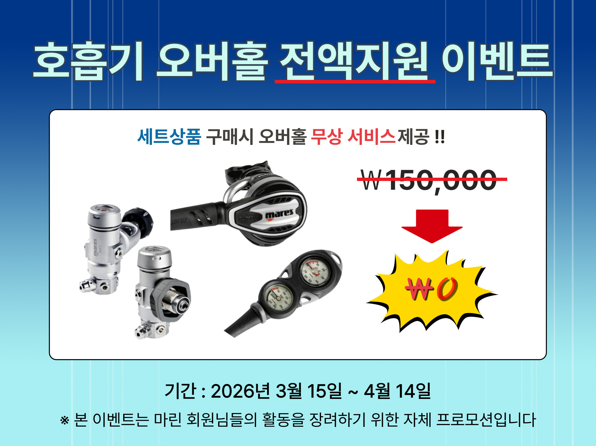 2026시즌을 맞이하여 스쿠버 다이빙 레귤레이터 세트 상품을 구매하신 분께 오버홀 무상 서비스를 제공합니다.